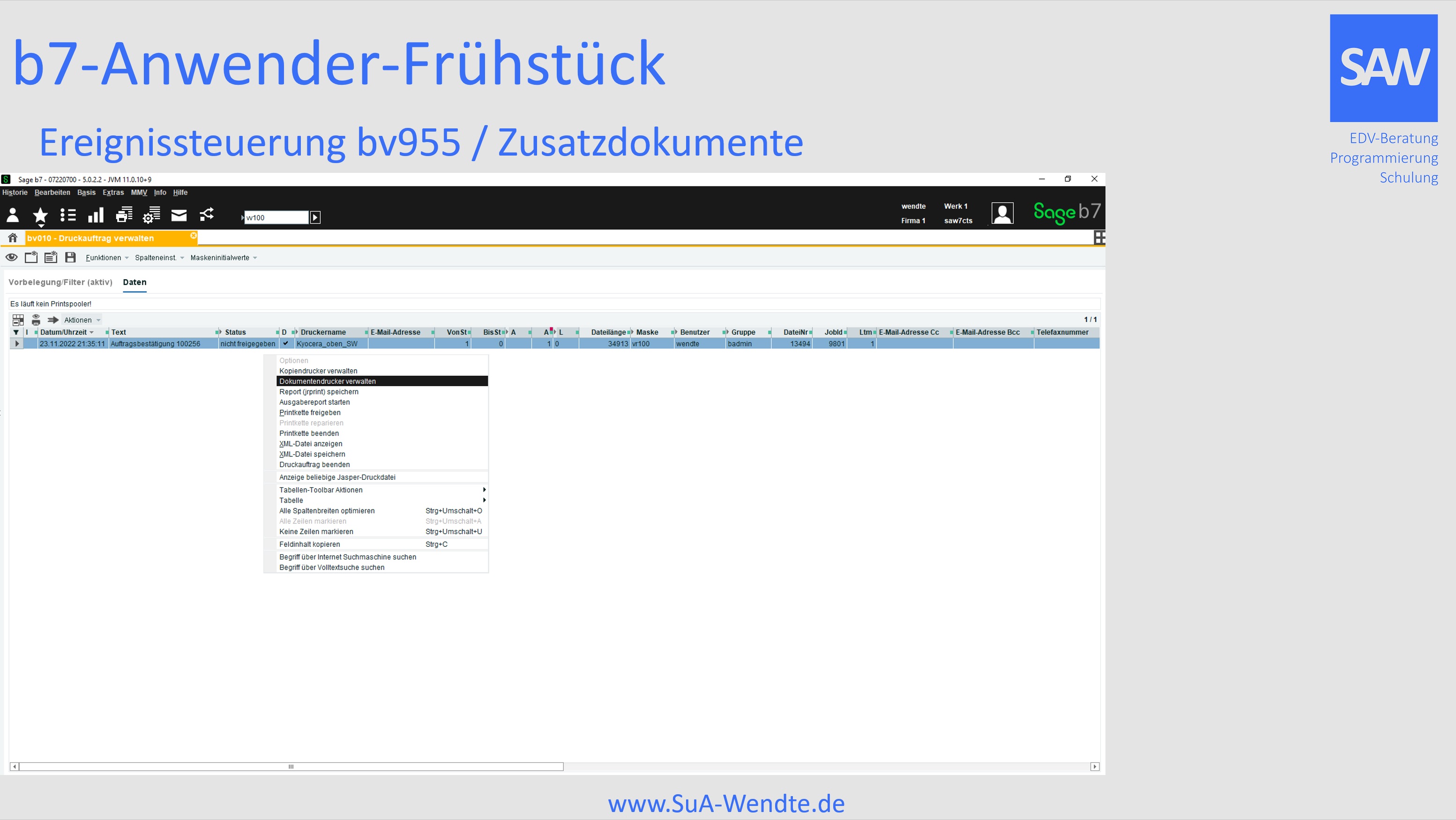 In diesem Anwenderfrühstück möchten wir uns mit Ihnen das Drucken von Zusatzdokumenten ansehen und ihnen zeigen, wie Sie Dokumententypen/Dokumentengruppen pflegen und Zusatzdokumente letztlich zuordnen und mit ausdrucken.